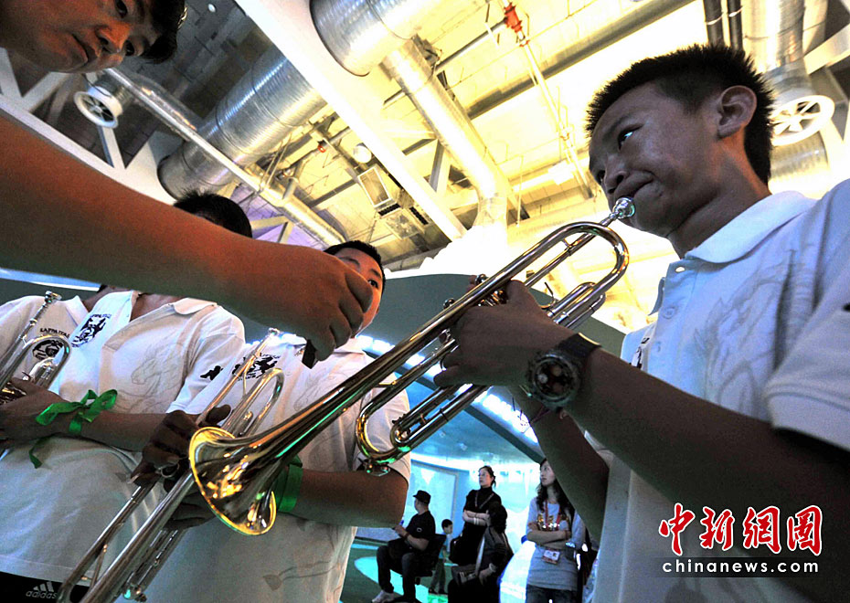5月2日清晨,來自玉樹地震災(zāi)區(qū)結(jié)古鎮(zhèn)的藏族小樂手巴東珠,含著姐姐在地震中不幸遇難的悲痛心情,與小白楊中學(xué)生管弦樂團(tuán)來到上海世博會,為中國青海館觀眾獻(xiàn)上一曲《在那遙遠(yuǎn)的地方》。他悲歡交融的情懷和演藝,感動全場。巴東珠之前還是青海省人民醫(yī)院為地震傷員做藏語翻譯的志愿者。中新社記者 賈國榮 攝