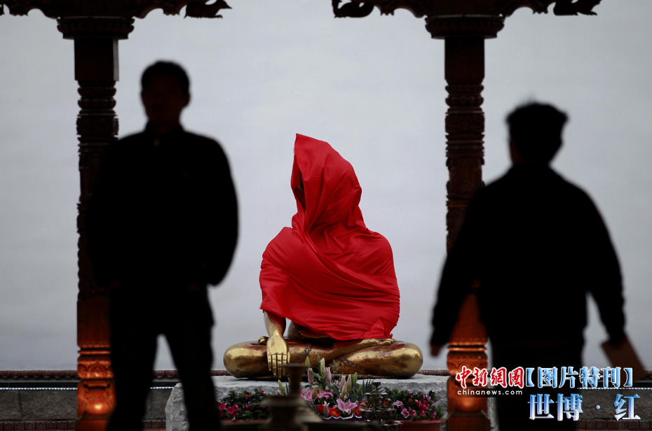 紅色象征著熱量與活力,紅色也象征著興奮與激情,在世博園區內游覽,總會有一抹濃艷的紅色闖入到記者鏡頭之中,讓世博變得更加火辣。圖為尼泊爾館的佛像。中新社記者 盛佳鵬 攝