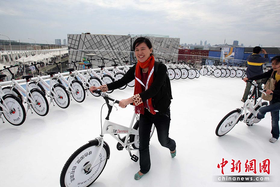 5月2日,上海世博會(huì)是第一個(gè)正式提出“低碳世博”理念的世博會(huì),圍繞著這樣的理念,上海世博園區(qū)內(nèi)的低碳元素比比皆是。圖為游客在丹麥館內(nèi)享受自行車帶來的樂趣。中新社發(fā) 湯彥俊 攝