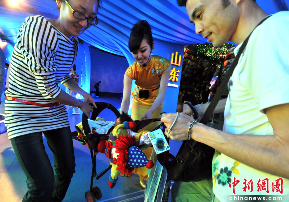 5月3日,上海世博會中國山東館一位禮儀小姐始終笑容可掬,許多參觀者都喜歡與外秀內(nèi)慧的她拍一張留影照。當(dāng)一對夫婦推著嬰兒車經(jīng)過時(shí),她迅速上前幫助抬下階梯。她因而享有全場最善解人意的禮儀小姐美稱。中新社發(fā) 賈國榮 攝