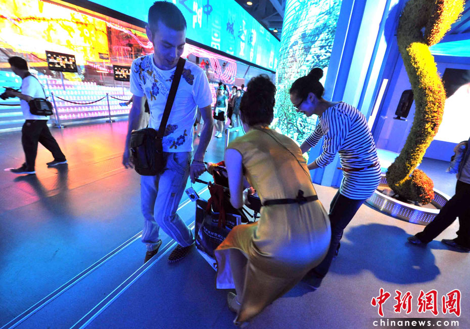 5月3日,上海世博會中國山東館一位禮儀小姐始終笑容可掬,許多參觀者都喜歡與外秀內慧的她拍一張留影照。當一對夫婦推著嬰兒車經過時,她迅速上前幫助抬下階梯。她因而享有全場最善解人意的禮儀小姐美稱。中新社發 賈國榮 攝