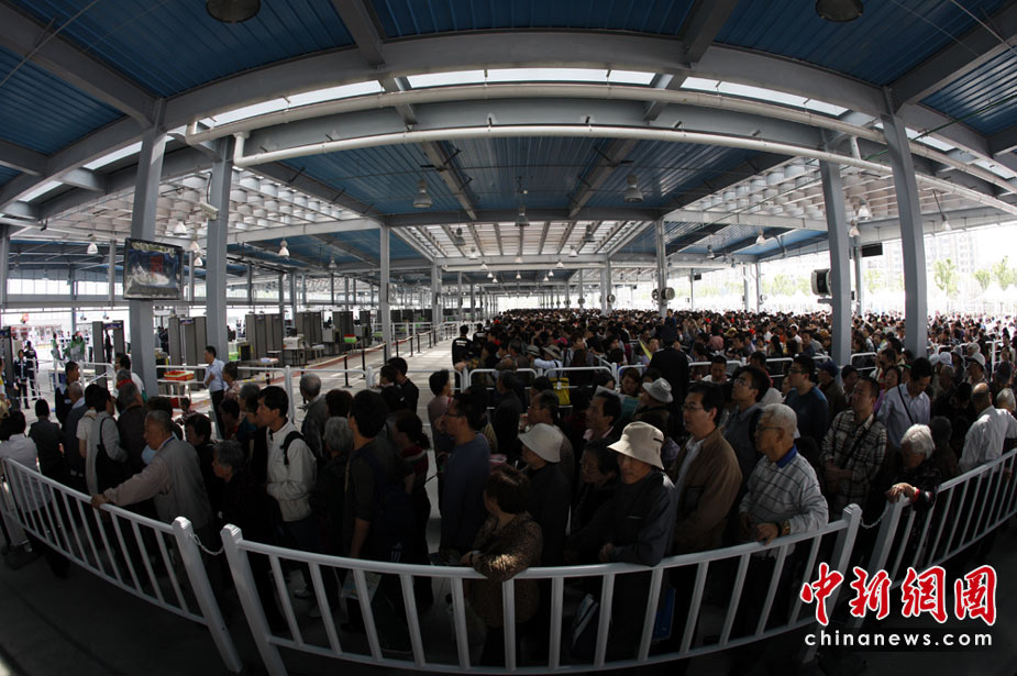 上海世博會4日迎來首個平日票的參觀客潮,圖為世博園區7號門入口外,還不到開園時間,已經有大批游客排隊等候。中新社記者 盛佳鵬攝