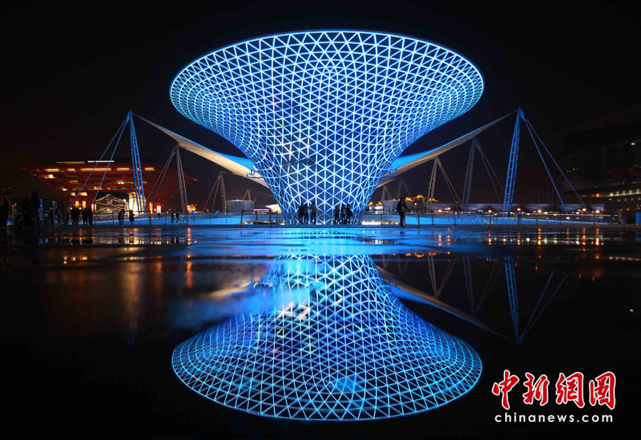 夜幕下的上海世博園區處處流露光華與璀璨,世博軸上的“陽光谷”成為一個個流光溢彩的“夜光杯”,以不同色調交織成流動的光影旋律,給游客們帶來難以忘懷的感受。 中新社發 宗金柱 攝