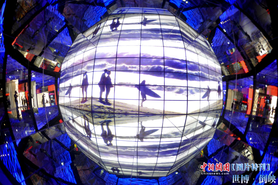 上海世博園內的巴塞羅那城市案例館,方形屏幕在周圍玻璃的倒映下形成球形視覺。中新社記者 廖攀 攝