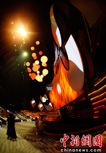 2010年5月4日,上海世博園區(qū)迎來首個(gè)平日票的參觀客潮。圖為準(zhǔn)備好迎接游客的阿聯(lián)酋館的影院。中新社發(fā) 盛佳鵬 攝