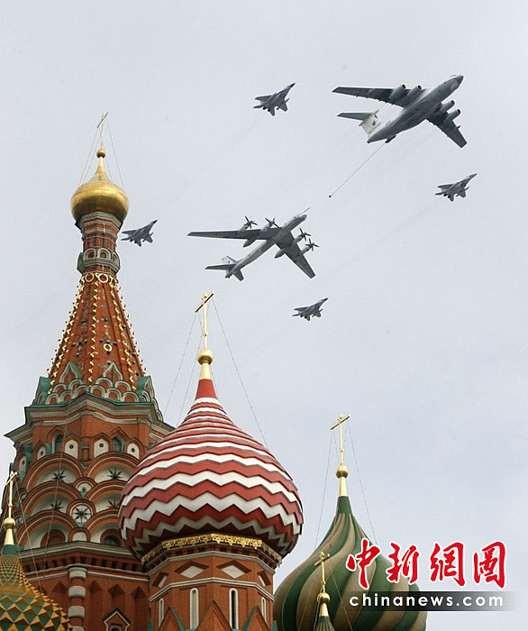 當地時間5月4日,在俄羅斯首都莫斯科,參加彩排的戰機編隊飛過紅場上空。俄羅斯將于5月9日隆重紀念衛國戰爭勝利65周年。圖片來源:中國新聞網
