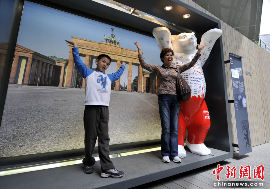 游客在圖片墻前模仿“柏林熊”的樣子拍照。中新網記者 王紅綱 攝