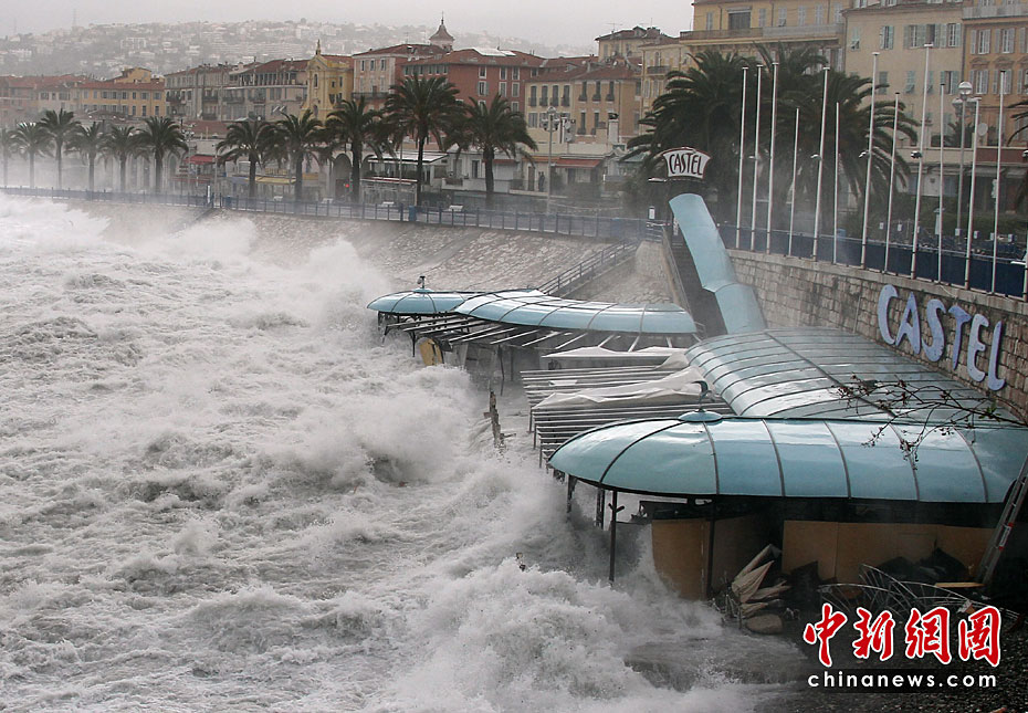 近日,在法國南部城市尼斯,巨浪襲擊城市的海岸后造成城市道路癱瘓。法國南部部分地區(qū)遭遇大風(fēng)和巨浪,使當(dāng)?shù)亟煌ê凸╇娛艿讲煌潭鹊挠绊憽D片來源:中國新聞網(wǎng)
