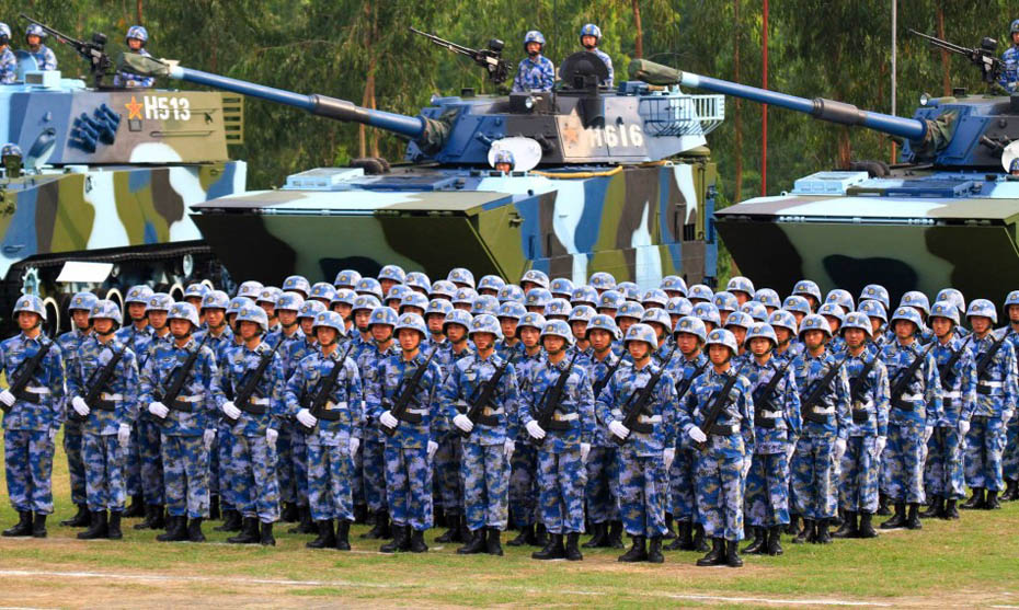 海軍陸戰(zhàn)隊員和新型裝備接受檢閱。圖片來源:新華網(wǎng) 查春明攝