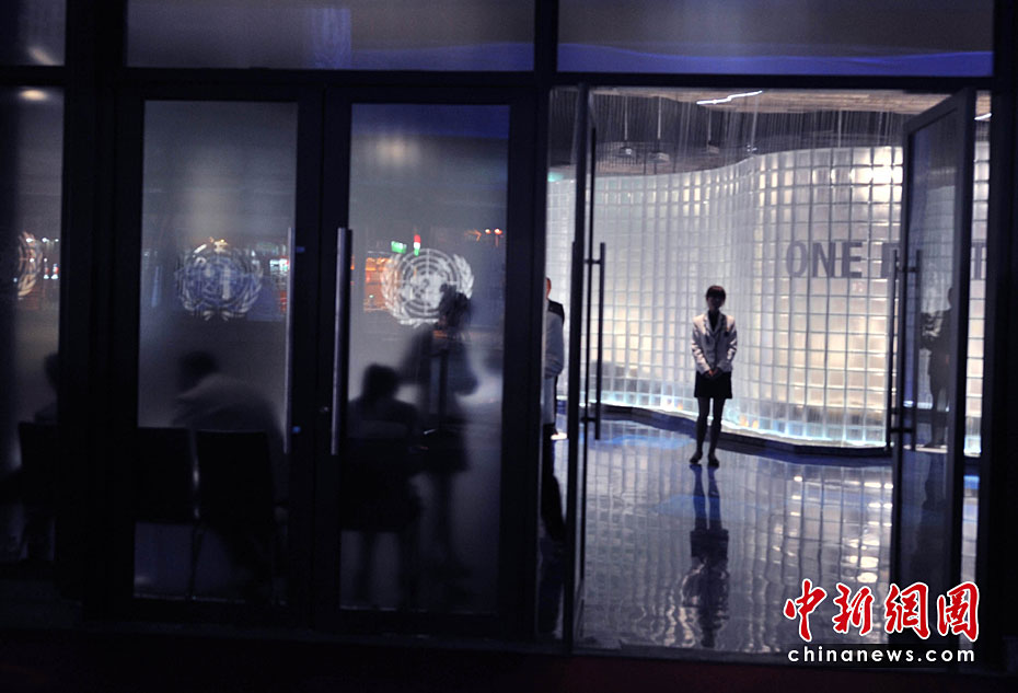 一所藍(lán)色的簡樸平房,在5月開園的上海世博會(huì)大道邊上,極不顯眼。但是,聯(lián)合國聯(lián)合館的鮮明會(huì)標(biāo),特別吸引人。這個(gè)展館集中了世界衛(wèi)生組織、世界銀行和聯(lián)合國的兒童基金會(huì)、糧農(nóng)組織、教科文組織等22個(gè)機(jī)構(gòu)。圖片來源:中國新聞網(wǎng) 賈國榮 攝