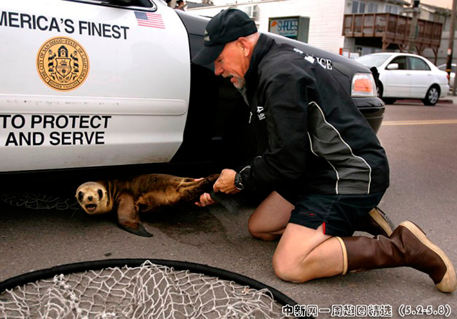 5月5日,在加利福尼亞州,動物護理專家羅賓森把一頭小海豹從圣地亞哥警車下拖出。小海豹之前在另一輛車下被發(fā)現(xiàn),看到警察要捉它就躲到了這輛警車下。圖片來源:中國新聞網(wǎng)>>點擊觀看詳細內容