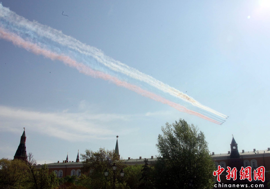 5月9日,俄羅斯在莫斯科紅場舉行盛大的閱兵式,慶祝衛國戰爭勝利65周年。莫斯科時間5月9日上午10點(北京時間9日下午2點)許,閱兵式正式開始。圖為最后一個接受檢閱的空中梯隊飛越紅場上空。中新網記者 張朔 攝