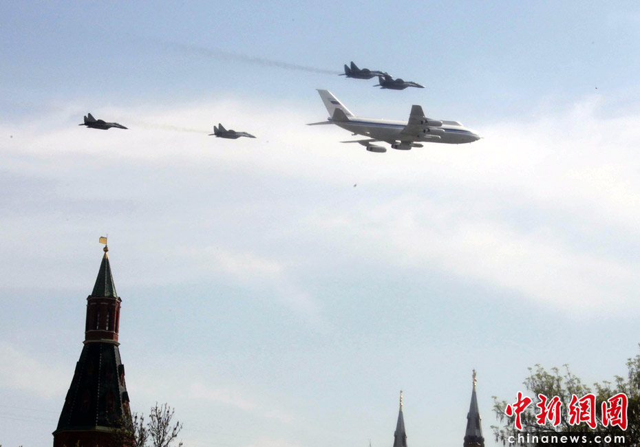 5月9日,俄羅斯在莫斯科紅場(chǎng)舉行盛大的閱兵式,慶祝衛(wèi)國(guó)戰(zhàn)爭(zhēng)勝利65周年。莫斯科時(shí)間5月9日上午10點(diǎn)(北京時(shí)間9日下午2點(diǎn))許,閱兵式正式開始。圖為空中梯隊(duì)飛越紅場(chǎng)上空。中新網(wǎng)記者 張朔 攝