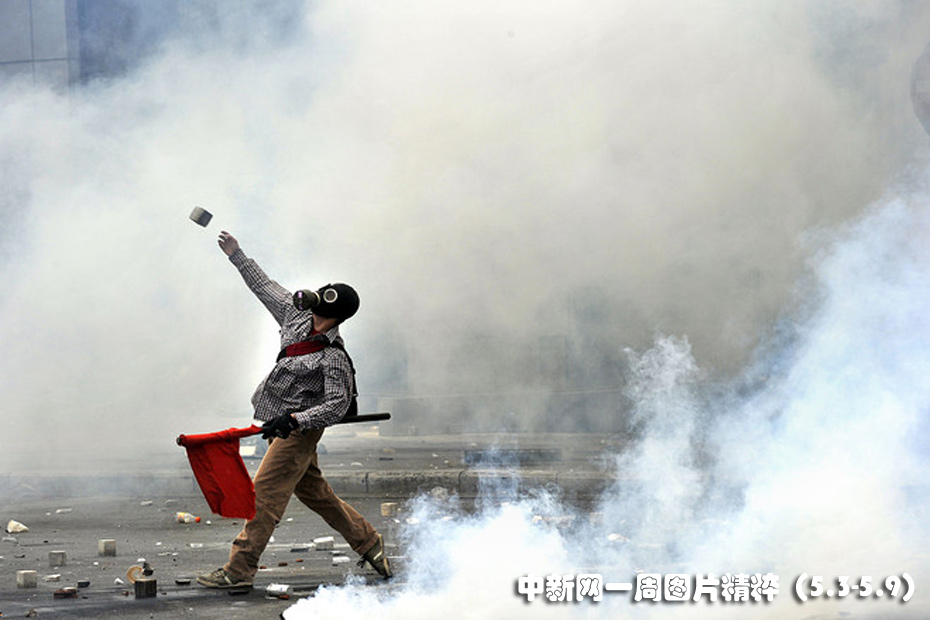 5月5日周三,在雅典的國會大樓附近,一名抗議者朝警察擲石塊。
