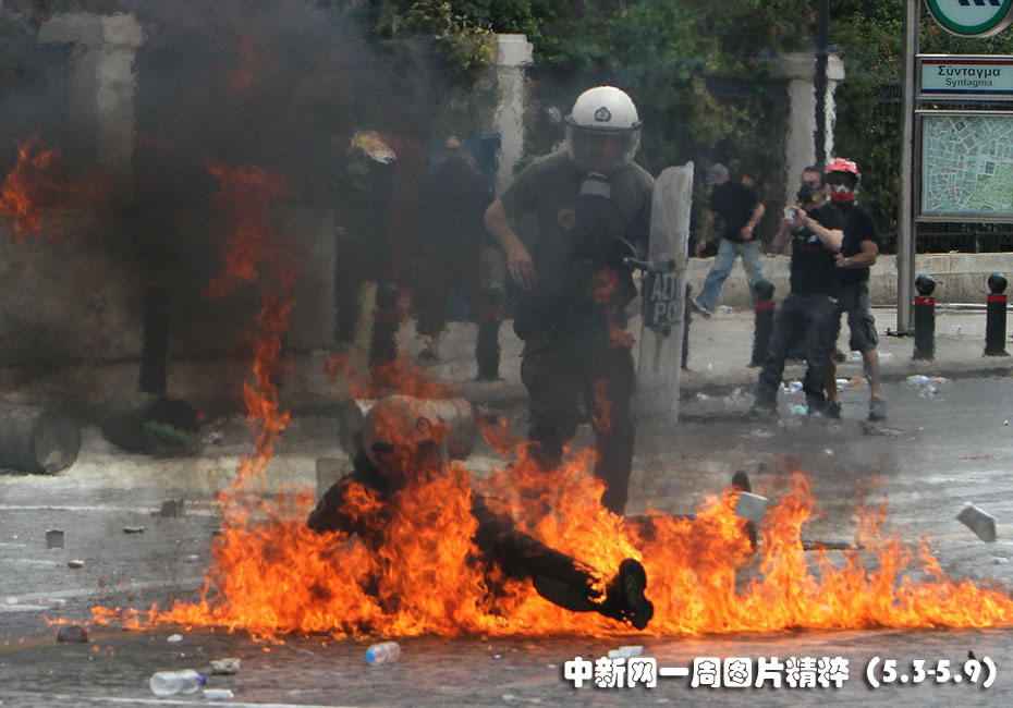 5月5日周三,在雅典舉行的反對大幅削減開支的抗議活動中, 一名防暴警察被困在火焰彈引發的團團火焰中。