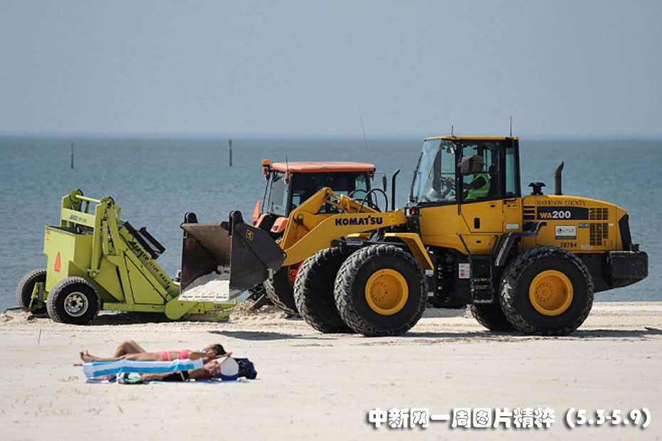 5月4日周二,在美國密西西比州加爾波特的一處海灘上,人們在享受日光浴,根本不理會旁邊駛過的重型機械車。