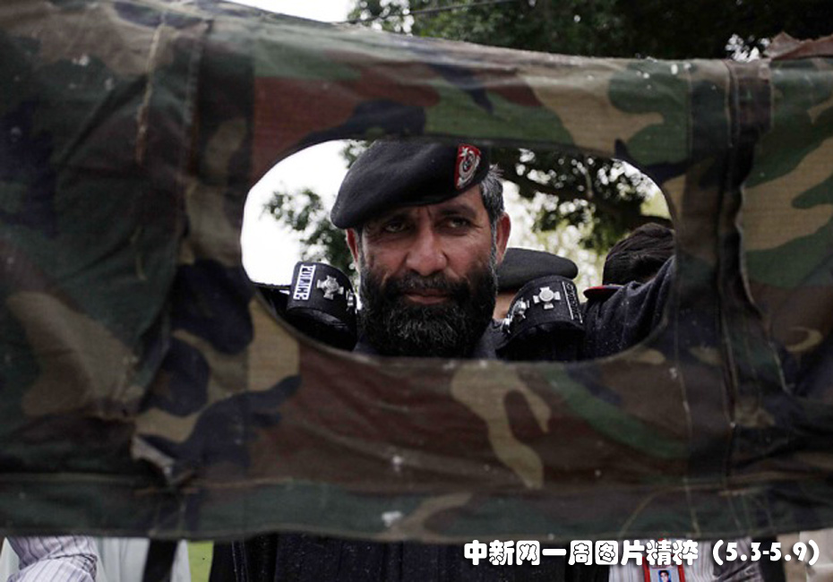 5月6日周四,在巴基斯坦白沙瓦,警察向媒體展示一名自殺式襲擊者的衣物殘骸。當地官員逮捕了兩名據稱發動了自殺式爆炸的嫌犯。