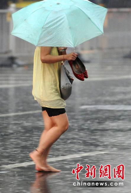 未來三天,青藏高原中東部、西南地區、江漢、江淮、江南、華南等地將持續陰雨天氣,其中,廣西南部、廣東大部、江西南部、福建南部、海南西北部、湖北大部、湖南北部、重慶大部等地有大雨或暴雨,局地有大暴雨。圖為5月9日傍晚,佛山市禪城區文華北路,一個女孩光著腳在雨中前行。崔景印 攝