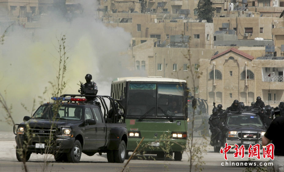 5月11日,約旦特種部隊在安曼空軍基地附近舉行演習,為特種作戰部隊展覽會(SOFEX)開幕式助興。該展覽會為期4天,展覽主題包括國家安全及反恐措施。圖片來源:中國新聞網