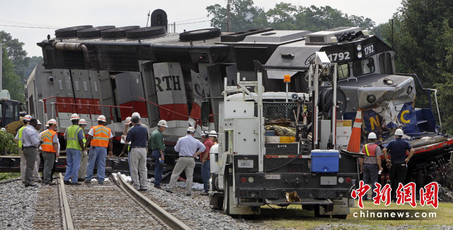 美國北卡羅來納州一列載有36人的通勤列車13日發生脫軌事故,造成至少13人受傷,火車頭和一節車廂起火。圖片來源:中國新聞網