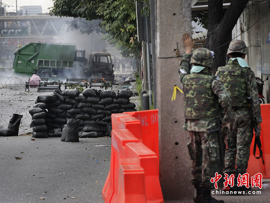 泰國政府軍和反政府示威者5月14日深夜在曼谷爆發嚴重暴力沖突。曼谷緊急醫療機構15日稱,截止當地時間早晨6時,沖突已導致16人死亡,至少141受傷,傷者中包括3名外國人。圖片來源:中國新聞網