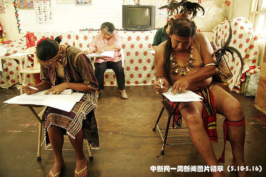 周一(10日),在菲律賓碧瑤市,身著傳統(tǒng)服裝的伊哥洛原住民老者尼古拉•卡沃德(Nicholas Cawed,右),和女兒米亞·尼古拉·卡沃德(Mia Nichole Cawed)填寫(xiě)總統(tǒng)選票。