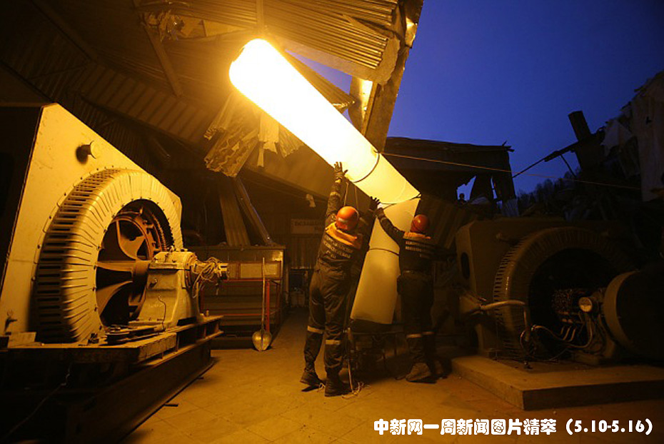 周一(10日),在俄羅斯的梅日杜列琴斯克地區,工作人員在被煤礦爆炸損毀的大樓內安裝照明設施。上周發生的礦難導致至少32人遇難,58人被困于地下。