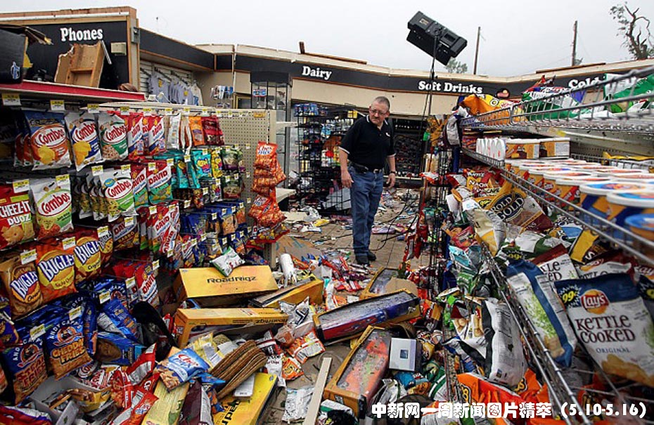 周二(11日),在美國俄克拉荷馬市東部的一處卡車休息站,沃倫·華爾滋(Warren Waltz)查看受災情況。龍卷風周一襲擊了美國南部平原,當時汽車被吹離高速公路,房屋被掀翻,目前已有至少五人遇難。