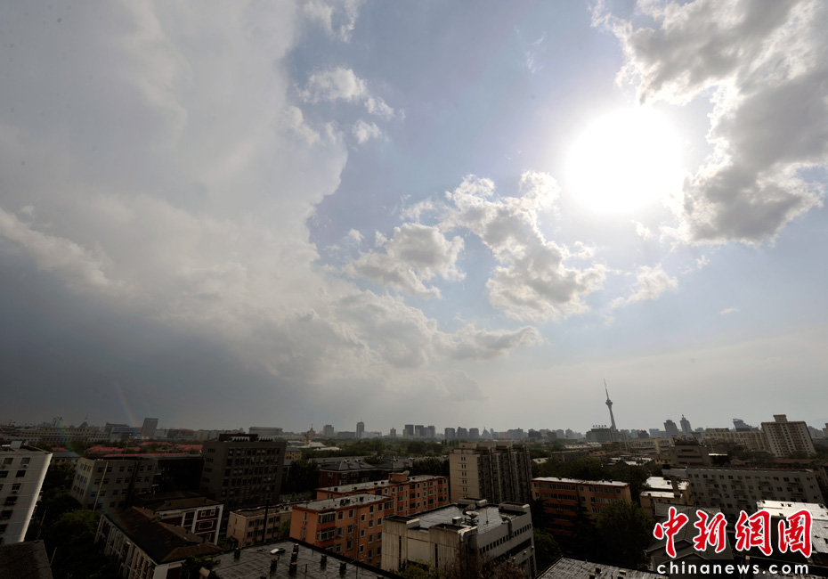 5月18日16時(shí)許,伴隨陣陣?yán)茁暰┏峭唤荡笥辏涤赀^(guò)后東部天空依然籠罩著烏云,而西邊卻已放晴。中新網(wǎng)記者 金碩 攝