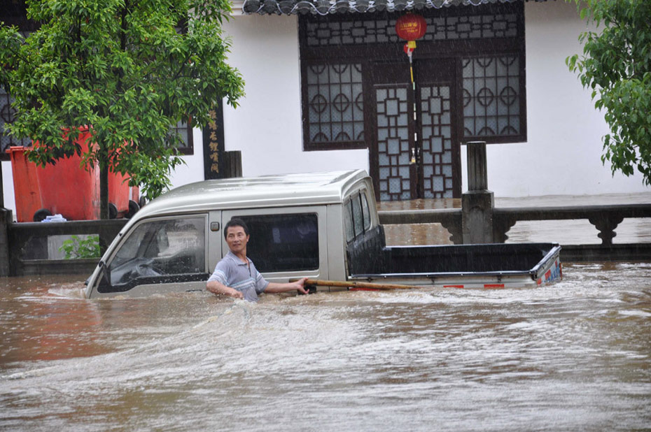 2010年5月18日,江西婺源遭受暴雨洪澇災害,在婺源縣城,一輛汽車和車主被洪水圍困。單長華 攝 (圖片來源:新華網)