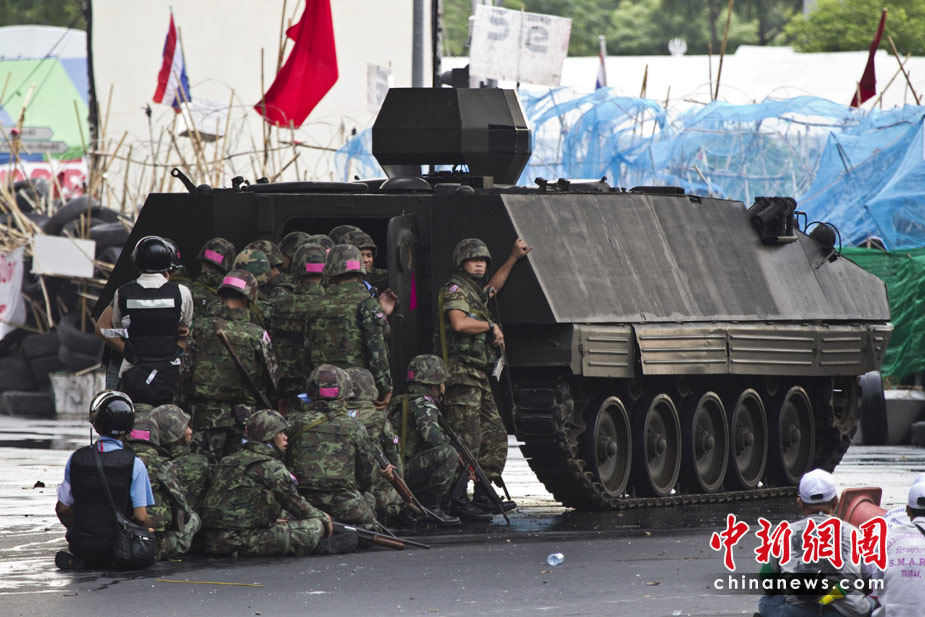 19日清晨,數百名軍警在武裝車輛的掩護下向反政府示威者在曼谷的大本營聚集。自上周四紅衫軍與政府在曼谷爆發沖突以來,已經導致39人死亡,數百人受傷。