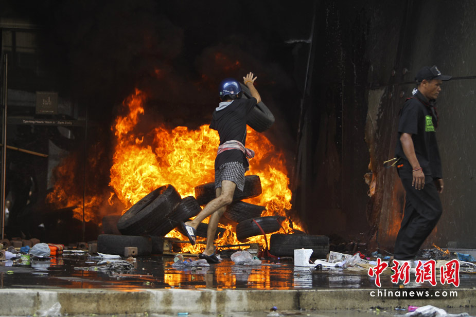 泰國軍方19日清場(chǎng),希望將陷入內(nèi)戰(zhàn)邊緣的曼谷拯救出來,雖然紅衫軍節(jié)節(jié)敗退,但有激進(jìn)分子未肯罷休,四處放火,電視臺(tái)、股票交易所、電力公司、幾間銀行、商場(chǎng)戲院都遭殃,商場(chǎng)和便利店亦成為搶掠目標(biāo)。據(jù)報(bào)曼谷有27處地方起火,泰國最大的商場(chǎng)Central World、Siam Square和Siam Paragon三大購物中心被縱火,其中Central World燒通頂,據(jù)報(bào)快將倒塌。