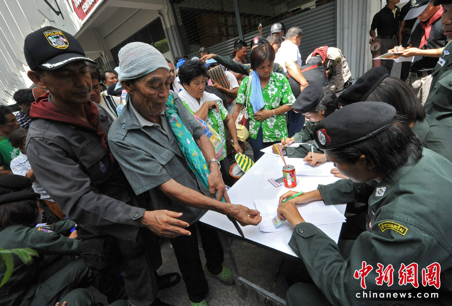 5月20日,數(shù)千名結(jié)束集會的外地“紅衫軍”示威者在曼谷拉差巴頌地區(qū)接受登記和安全檢查后,乘坐政府安排的車輛返回家鄉(xiāng)。