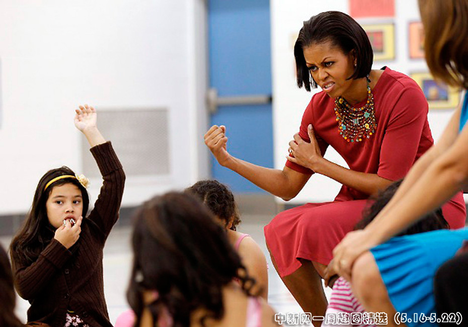 近日,美國第一夫人米歇爾·奧巴馬到馬里蘭州銀泉小學看望學生。在體育課上,米歇爾彎曲胳膊繃緊肌肉。圖片來源:中國新聞網