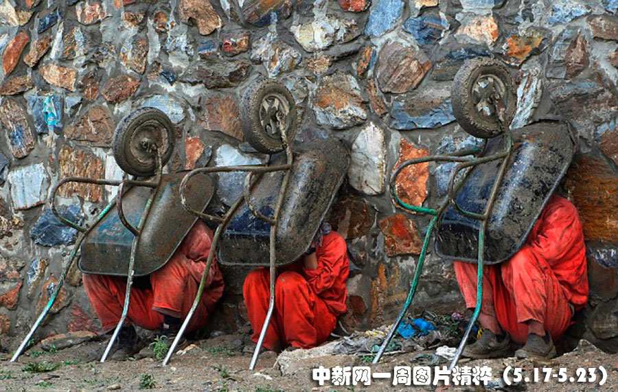 5月18日,阿富汗喀布爾發生了一起自殺式襲擊。圖為被雇來去清理廢墟的工人在獨輪小推車下避雨。