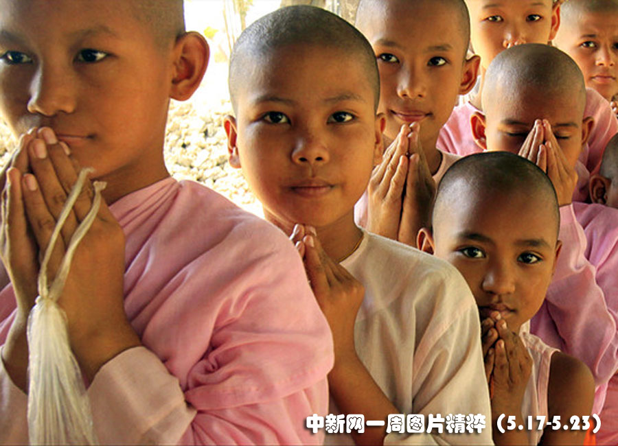近日在緬甸仰光,孤兒們在寺院內排起長隊集體接受捐贈食物。大約300多名孤兒住在這座寺院內。