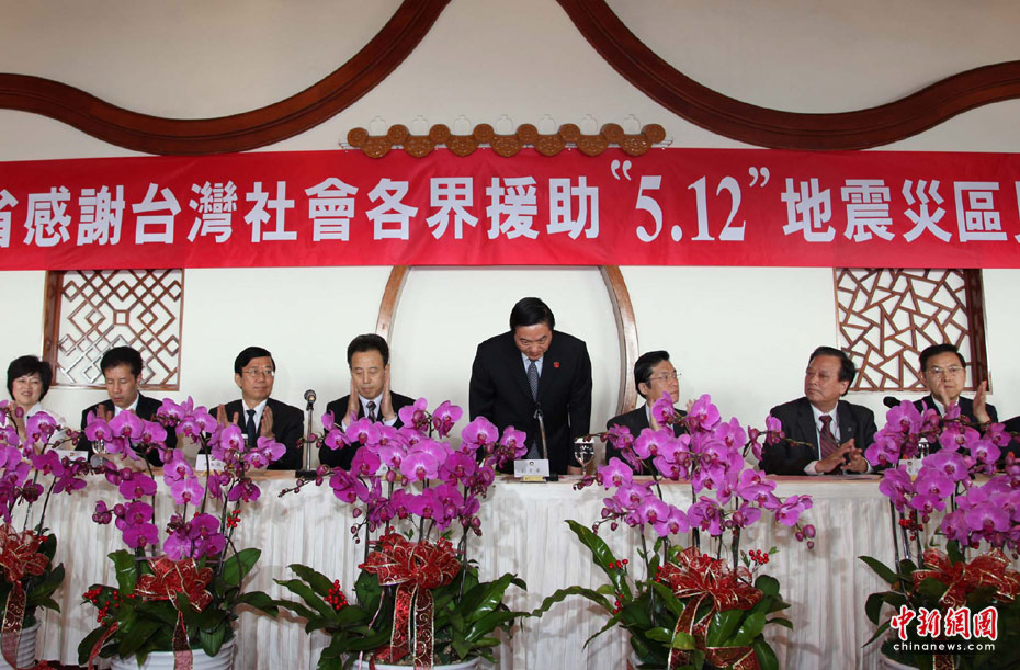 5月24日下午,“四川省感謝臺灣社會各界援助‘5.12’地震災區見面會”在臺北圓山飯店舉行,首度訪臺的中共四川省委書記劉奇葆于致辭時,兩度鞠躬感謝臺灣同胞積極援助四川災區,展現出血濃于水的同胞大愛。 中新網記者董會峰攝