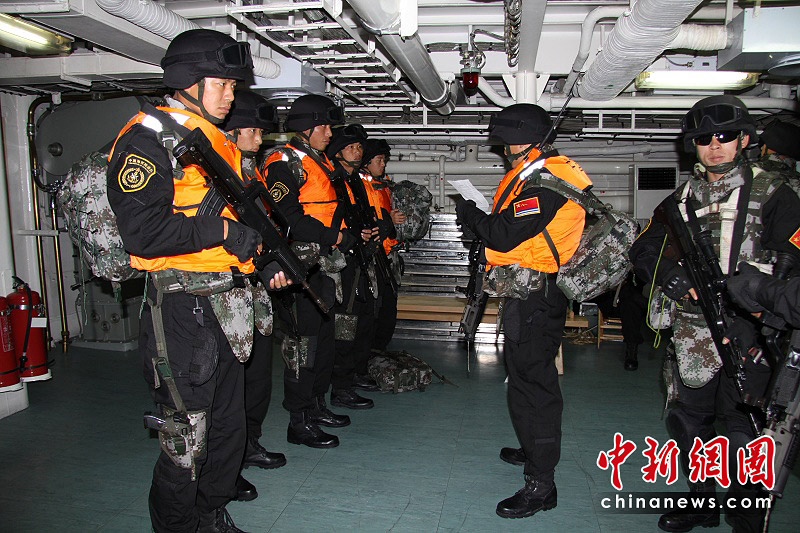 3月7日,新加坡海峽特戰隊員在船艙中集合。胡軍 攝