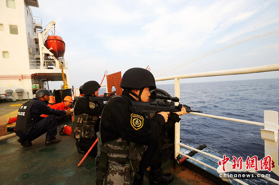 4月15日傍晚,在特戰隊員現場指揮下,軍民聯合反海盜演練在“嘉永山”輪船上甲板緊張有序地展開。江山 攝