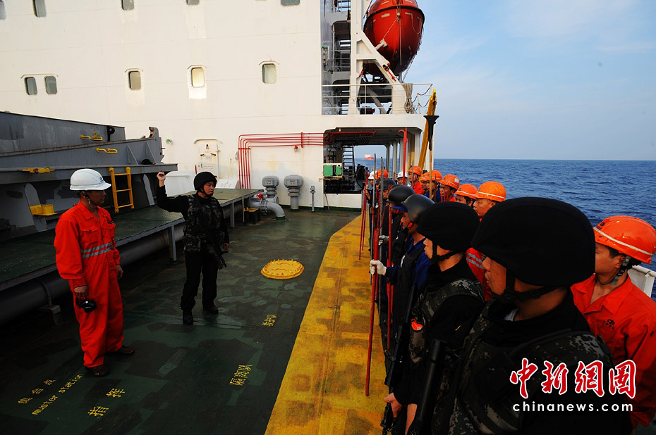 特戰隊小組領隊屈曉偉參謀在甲板上進行軍民聯合反海盜演練部署。江山 攝