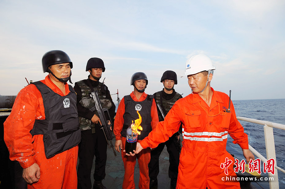 船員在特戰隊員的指導下,進行自制燃燒彈的投擲訓練。江山 攝
