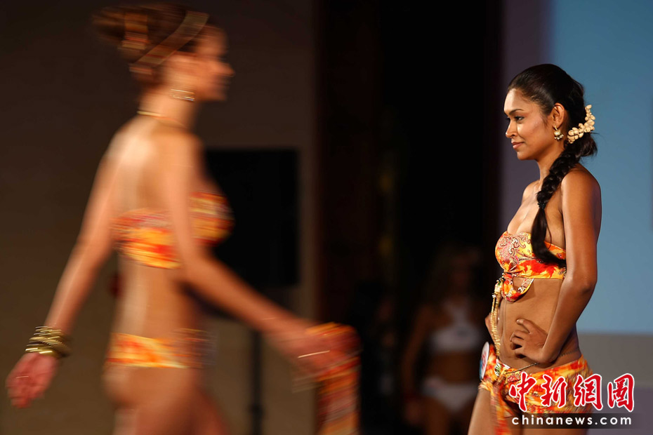 5月24日晚,在海南三亞參加第35屆國(guó)際比基尼小姐全球總決賽的64位各國(guó)佳麗們,展開了比基尼泳裝DIY設(shè)計(jì)和最佳身材的比拼。最終來(lái)自西班牙與烏克蘭的組合Marrero和Struk獲得了泳裝DIY設(shè)計(jì)的金獎(jiǎng)。泰國(guó)佳麗Prapahan摘得最佳身材的桂冠。圖為佳麗們?cè)谡故咀约涸O(shè)計(jì)的泳裝。中新社記者 富田 攝