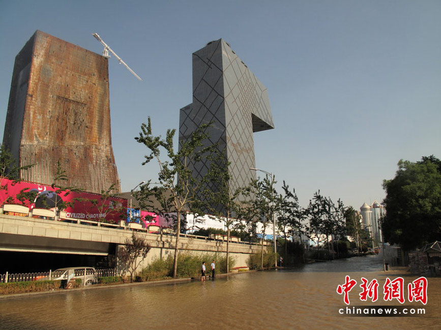 2010年5月25日下午4點半左右,北京京廣橋附近發生水管爆裂,水柱噴射到兩層樓高,流出的水已成河,造成東三環嚴重擁堵。沈軍 攝