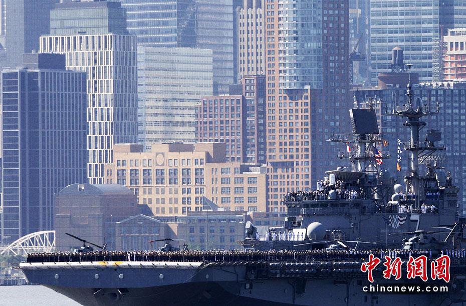 當地時間5月26日,美國第23屆紐約艦隊周開幕,包括“硫磺島”號兩棲攻擊艦在內的11艘參加艦隊周活動的軍艦由南向北在哈得孫河面上游弋。紐約民眾將以?吭诼D哈得孫河86號碼頭的“無畏號”航母博物館為中心,展開為期一周的慶祝和紀念活動。圖片來源:中國新聞網