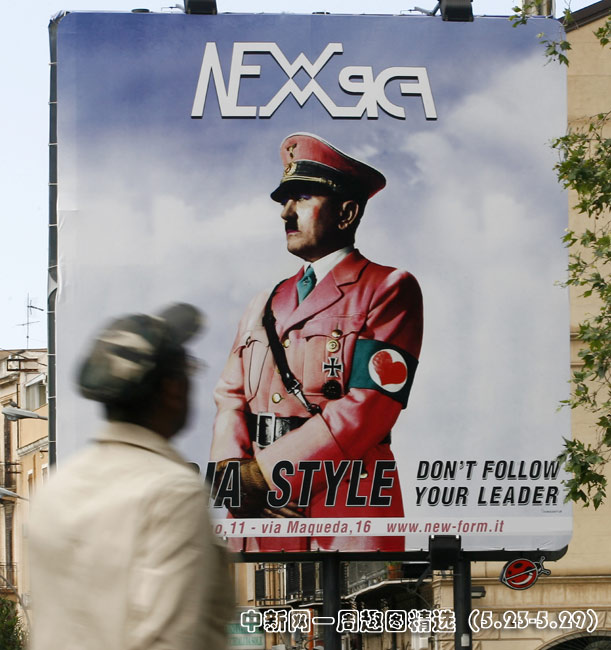 近日,意大利西西里首府巴勒莫街頭隨處可見一款備受爭議的海報——臭名昭著的納粹頭子希特勒化身“粉紅男郎”,納粹軍服胳膊上的納粹符號被大大的粉色心形圖案代替。圖片來源:中國新聞網>>點擊觀看詳細內容