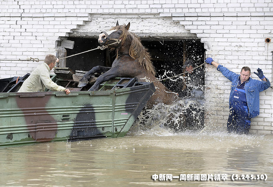 24日(周一),在波蘭Juliszew,農(nóng)民正哄著一匹馬跳進兩棲車。由暴雨引發(fā)的洪水已在波蘭造成至少15人喪生。