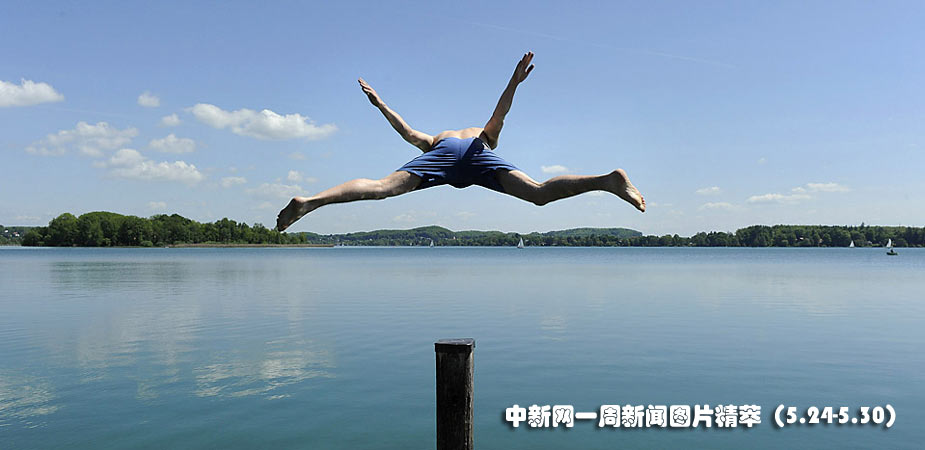 24日(周一),德國南部天氣炎熱,一名男子在河邊跳水。