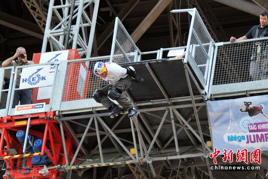 5月29日,法國巴黎,法國極限直排輪冠軍克里斯(Taig Khris)從法國艾菲爾鐵塔跳下,創下世界新自由落體紀錄。