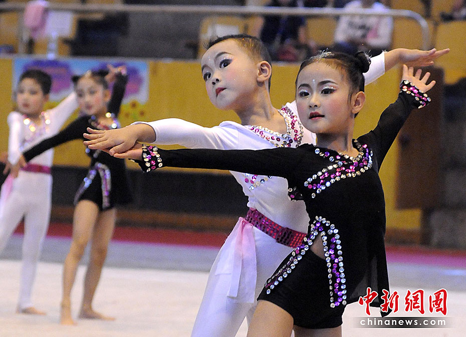 5月28日,小朋友表演幼兒基本體操。當日,河南省平頂山市體育部門舉辦2010年幼兒基本體操表演大賽,來自全市21個幼兒園的270余名兒童參加表演,以體育健身的方式迎接“六一”國際兒童節的到來。中新社發 王雙正 攝