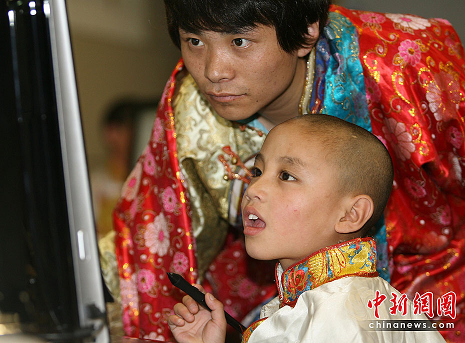 5月31日,玉樹地震孤兒多杰仁青在老師的指導下在北京國家圖書館體驗新開通的少兒數(shù)字圖書館,迎接六一兒童節(jié)。這批玉樹孤兒共23名,于5月23日抵京,由“中華少年兒童慈善救助基金會”安置。在北京度過“六一”后,他們還將休整3個月,待災區(qū)情況穩(wěn)定后,中華兒慈會將與當?shù)氐拿裾块T協(xié)商,在征求孤兒本人意愿的基礎(chǔ)上,或讓他們返回原地上學,或者在內(nèi)地長期居住。基金會將一直支持他們到18歲成人。中新社發(fā) 蘇丹 攝